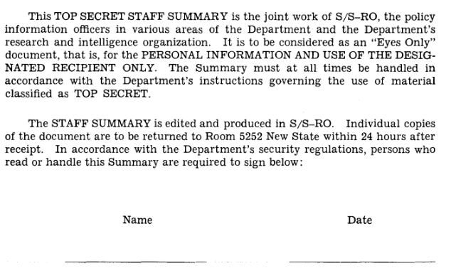I recently found another definition of “Eyes Only.” It appeared in a 1960 State Department “Daily Staff Summary” marked Top Secret Eyes Only. The second page includes two paragraphs of security warnings, the first of which actually defines “Eyes Only” as used here: