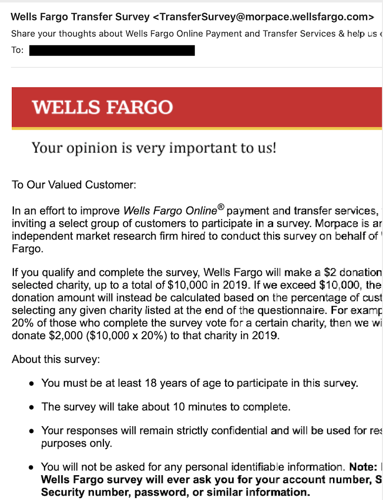 I recently received an email sporting “Wells Fargo” logos. It asked me to do a survey. It was actually sent from the domain ‘morpace.com,’ which used to belong to a product survey company. When I googled the name ‘morpace’ the first thing I found was that the company had probably changed its name over a year ago. That’s a red flag.