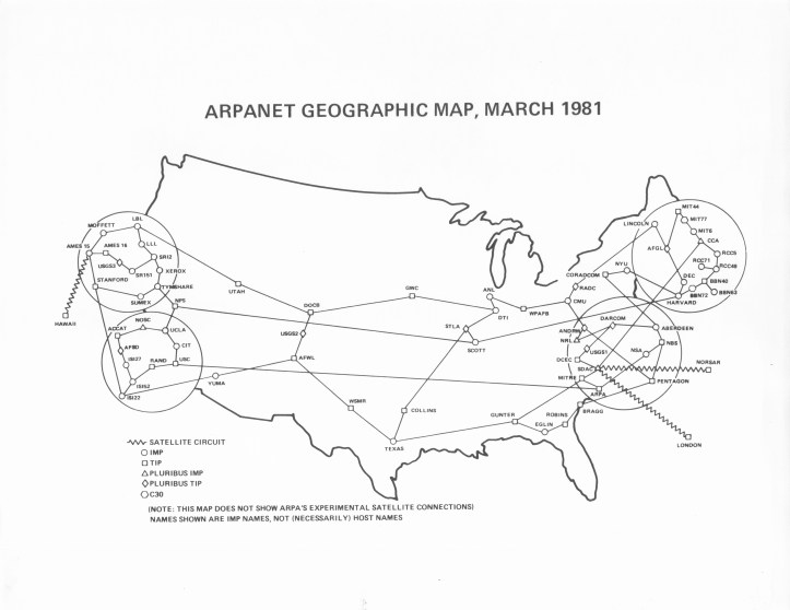 Here is a set of geographical maps of the ARPANET in the 1970s and 1980s. There is also one “logical” map that focuses more on which host computers were connected where.